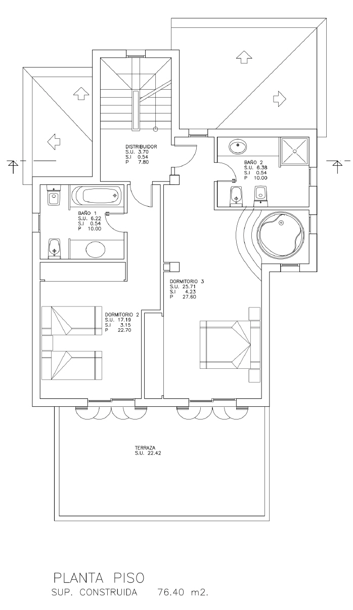 Obere Ebene mit 2 Schlafräumen und 2 Bädern auf einer Grösse von 76 qm.